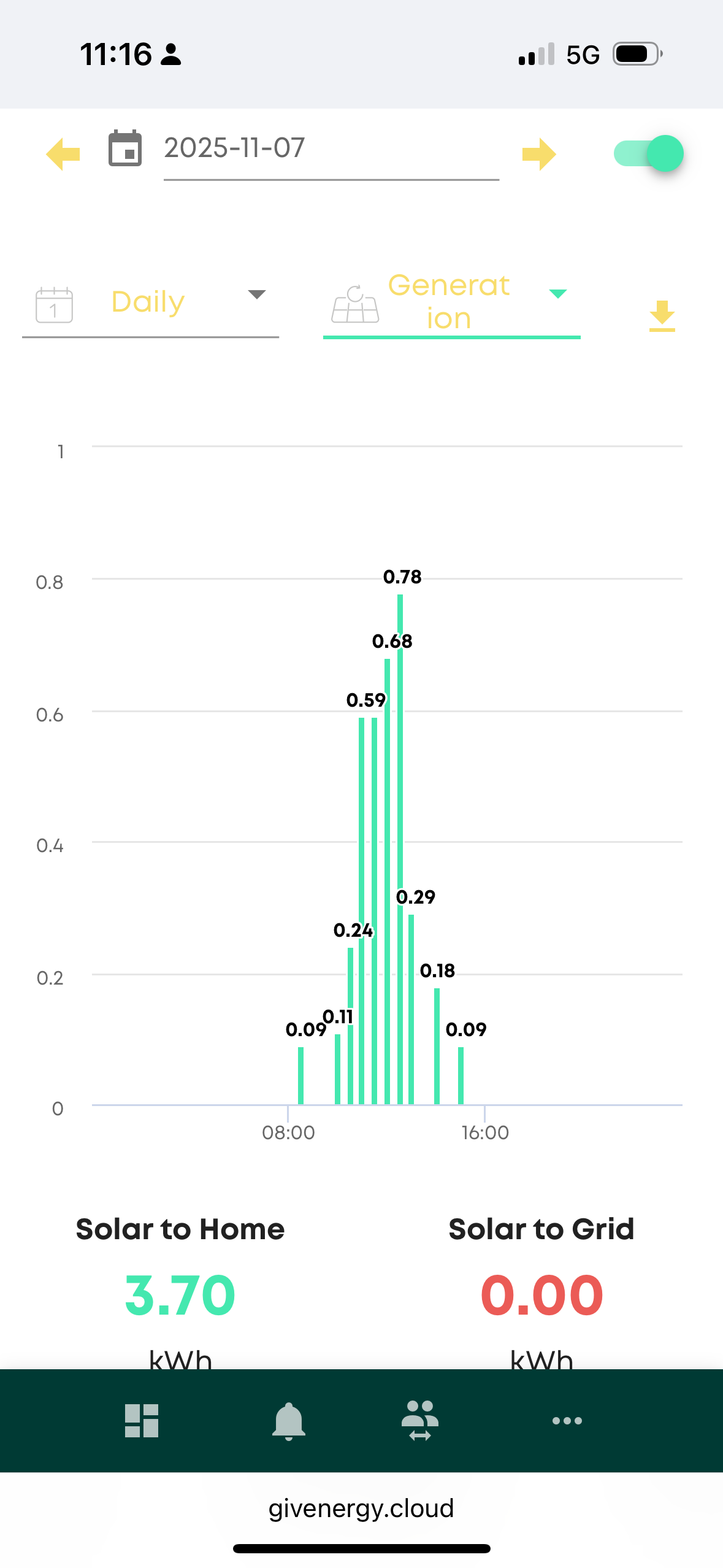 Very odd. It’s been correct today, but from 3 Nov to 7 Nov it was totally out of whack, showing a huge generation at a range of time from 0730 to 0900. Very odd.