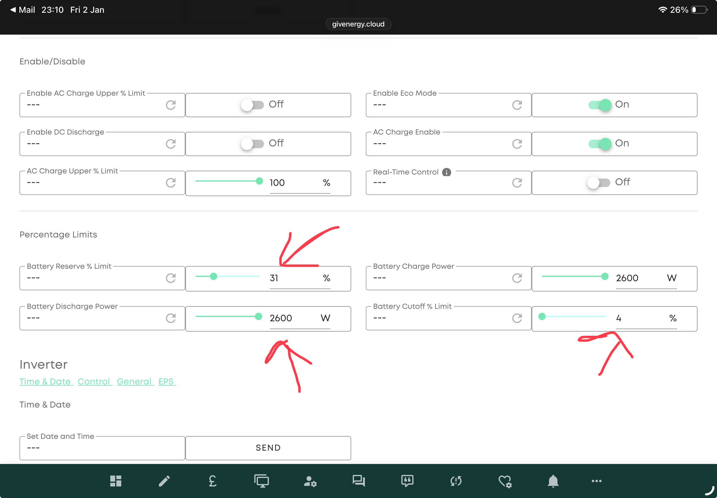Hi Geoffrey, sorry 1 more thing, we both have eco on, I have enable dc charge on, you are off. Then I have ac charge enable, you have off, should I be changing these 2 aswell?