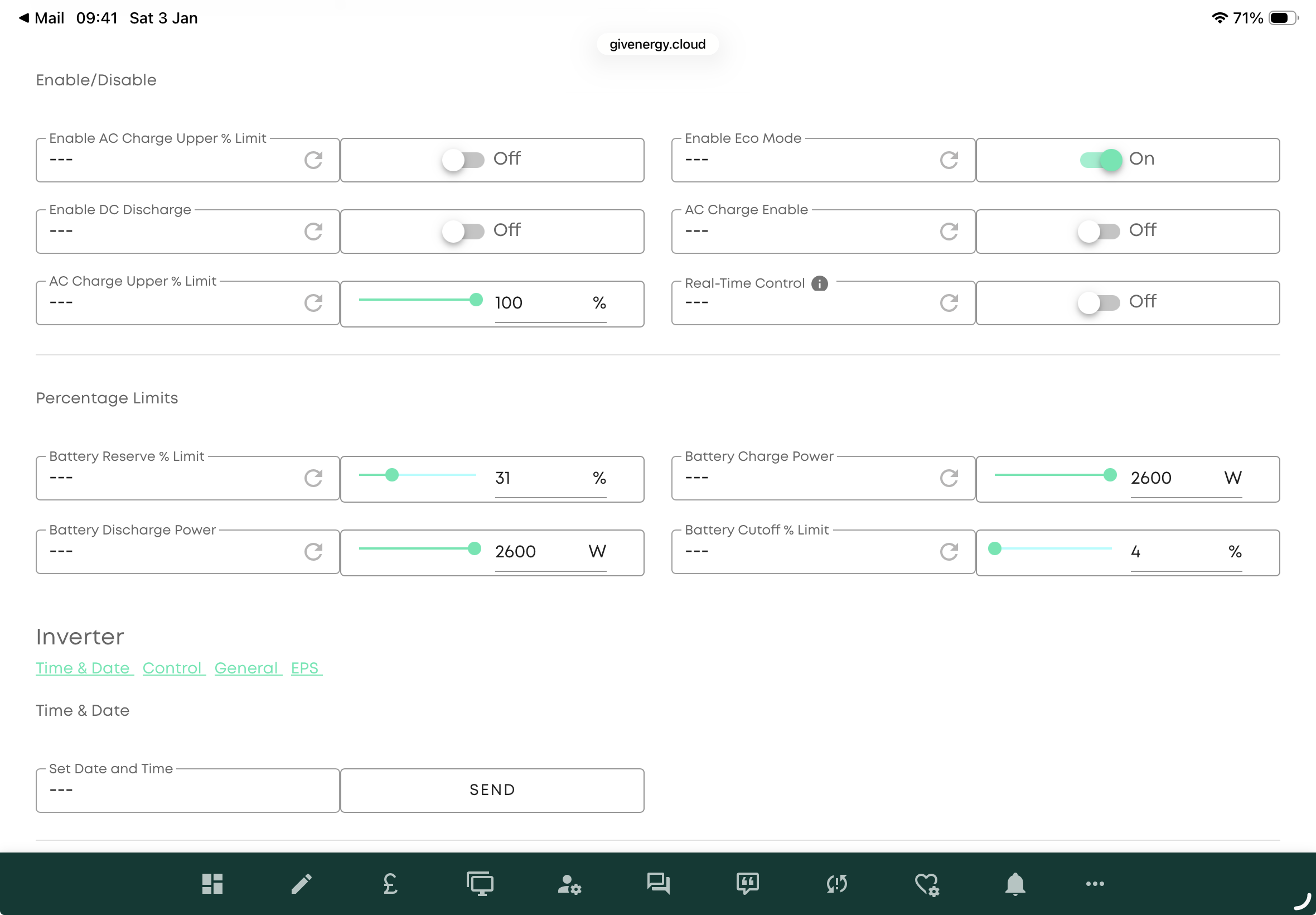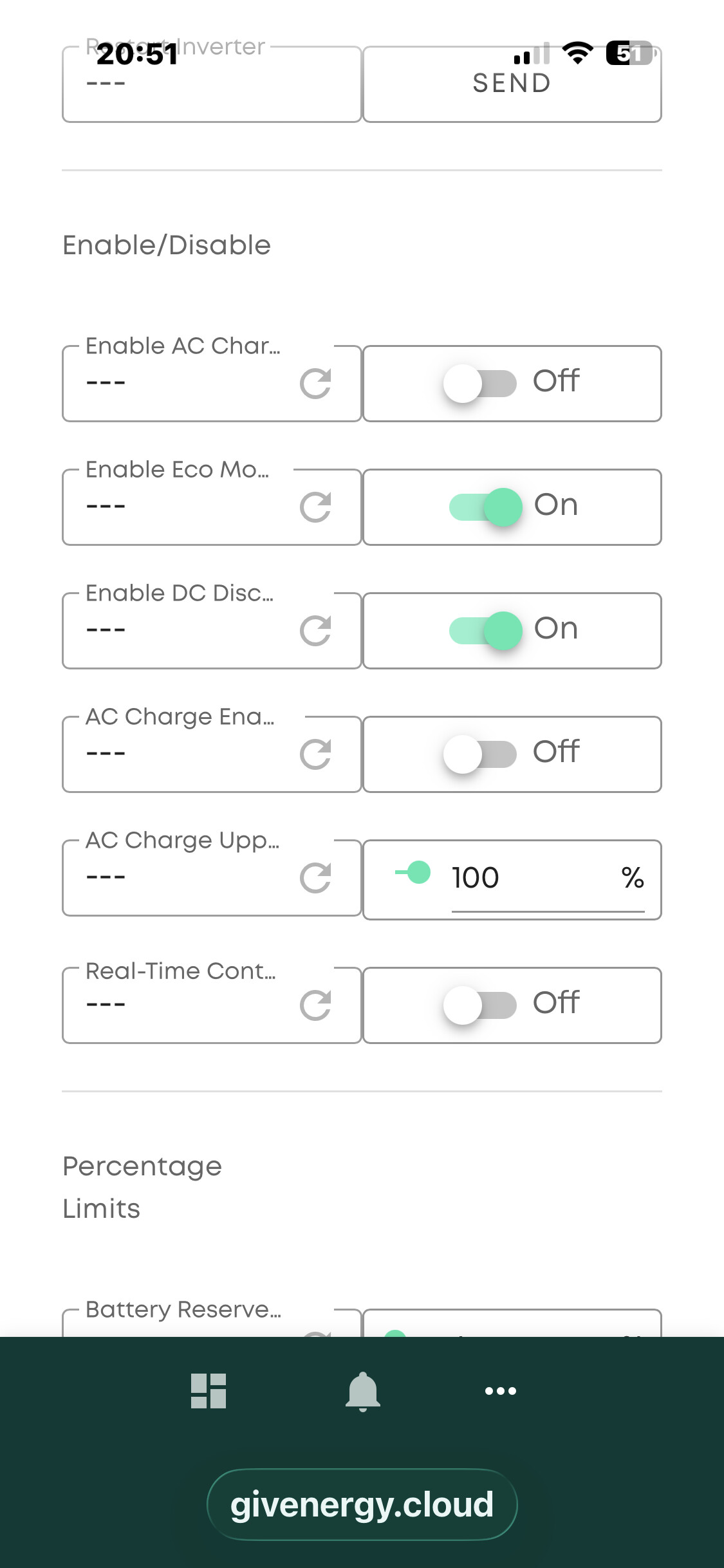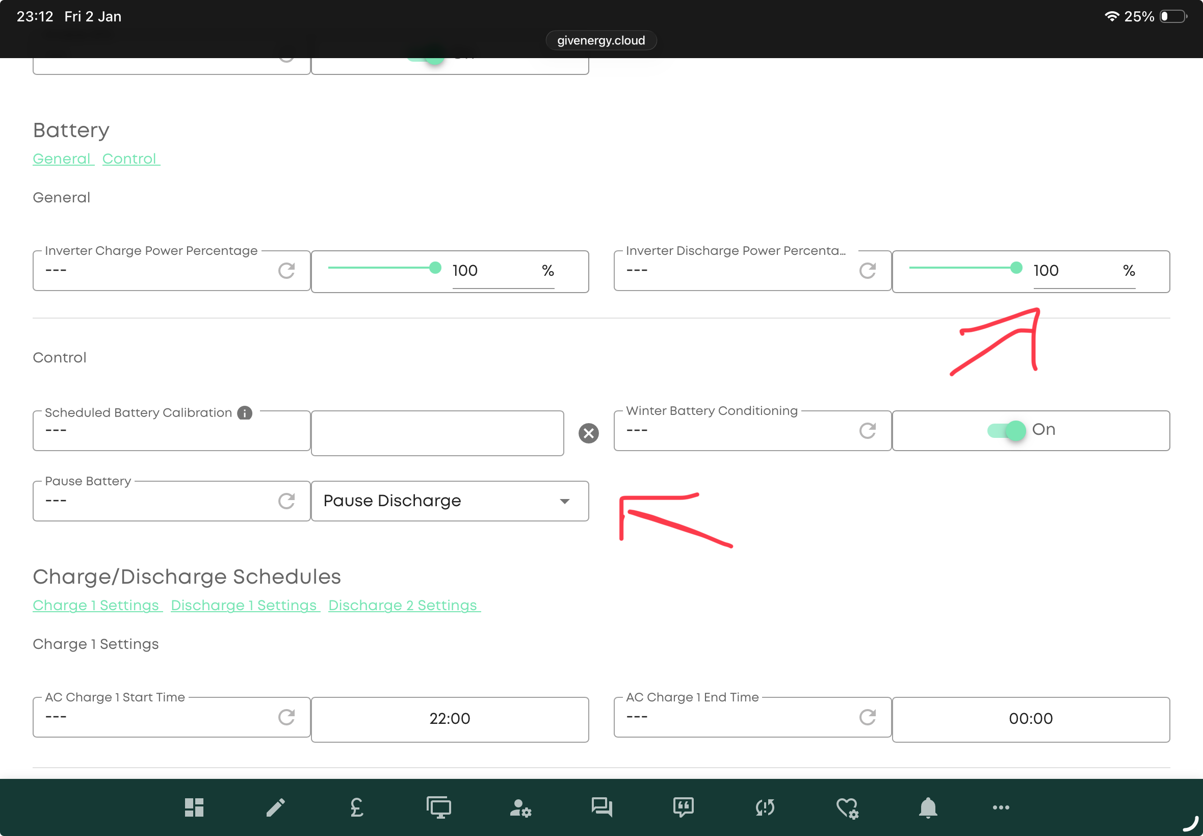 I’ve not had my system installed for very long and when I got notified that there was free energy from Octopus I paused my battery using the quick settings button so that I could avoid using the battery during this period. Once the period was over I used the quick settings again to unpause the battery. Since then my battery has been stuck on 100% - it isn’t being used at all to power anything and so I am using grid power even though I have a fully charged battery. I tried going to settings (it was on Eco mode) and I reset to defaults as well but nothing.