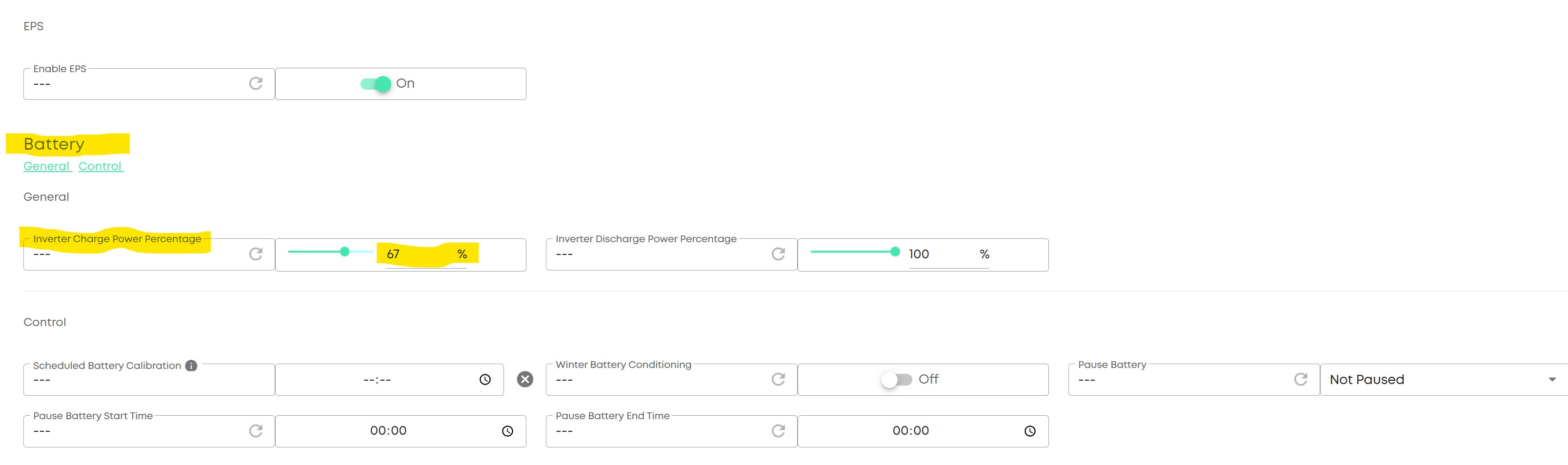 - Change the value for “Inverter Power Charge Percentage” to an appropriate lower % eg 4kW is approx 67% of maximum of 6kW, so input 67% then click on the large black ‘arrow’ that appears - this will write the new value to the registry… hopefully!