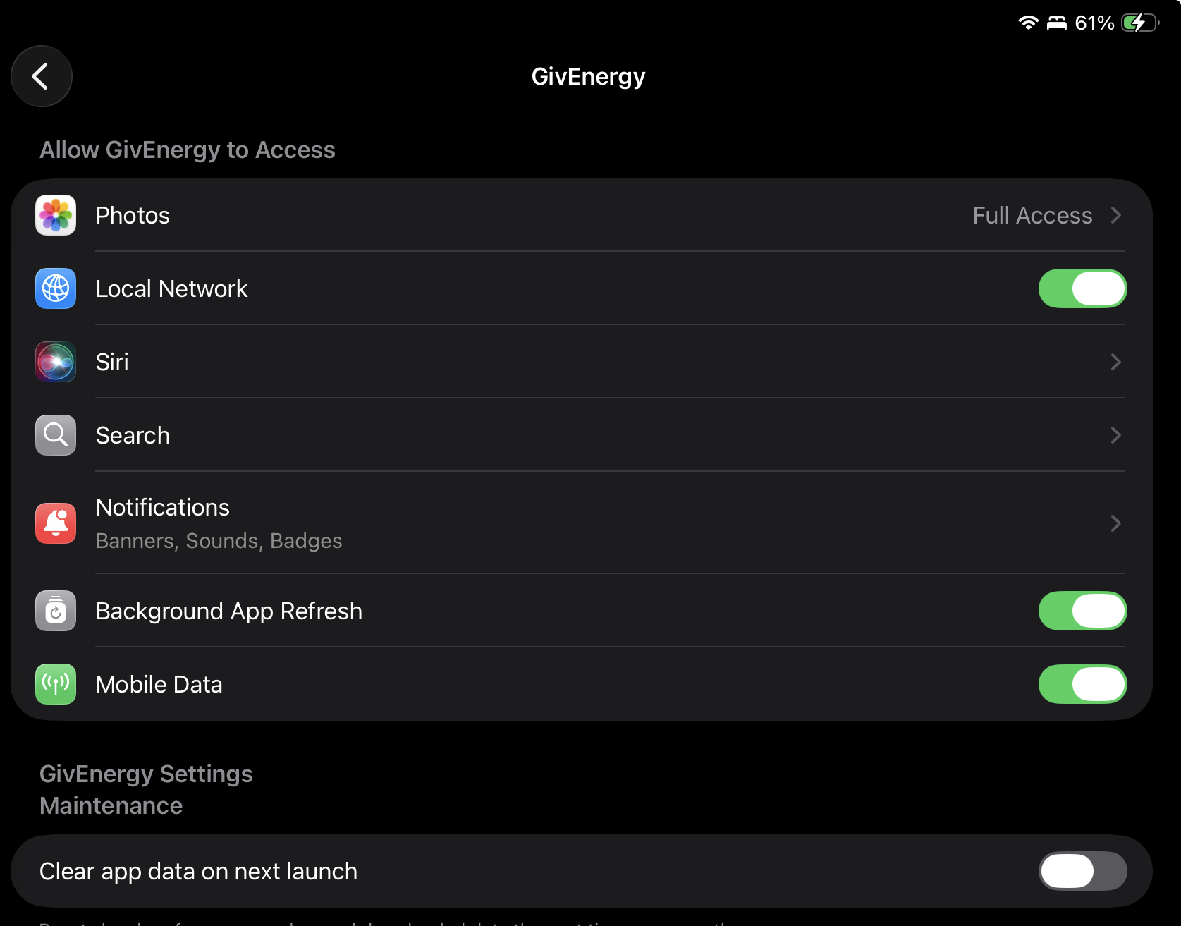 I have seen similar I think before, if you go into the givenergy app settings it needs to have local network turned on