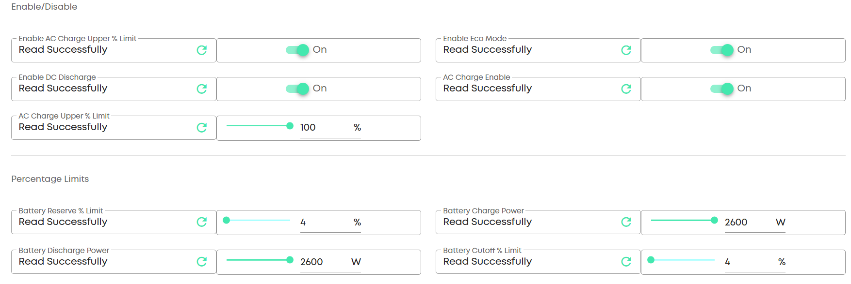 For each, check the values in the portal, click the little wheel next to each to download the value from the inverter, and try changing the setting to off then on to force the inverter to have the right settings