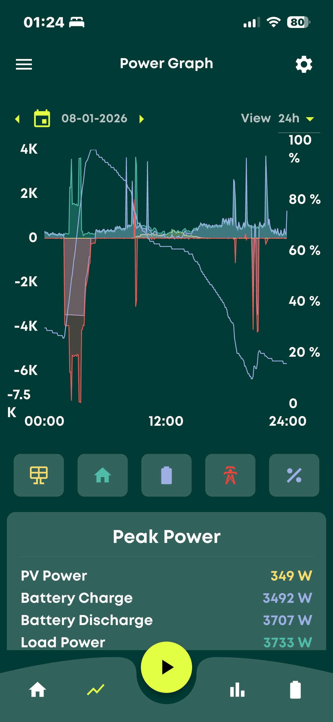 - charging at the Charge Power (using surplus PV which is available after meeting Load, with the balance coming from the grid); or
