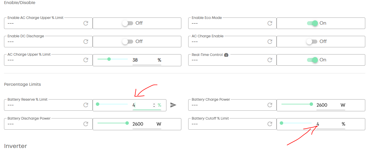 Changing Consumption Type from Full Export to Home Demand turns Eco Mode back on. Eco Mode is also turned back on if you change Discharge Mode from Scheduled to Dynamic.