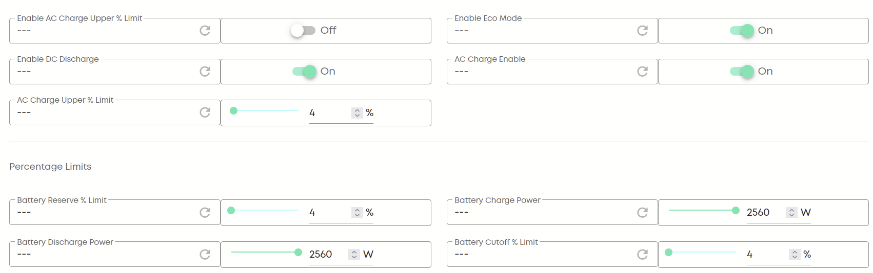 those settings look normal, except perhaps the charge and discharge rate; 2600W is more normal for a Gen 1 hybrid inverter