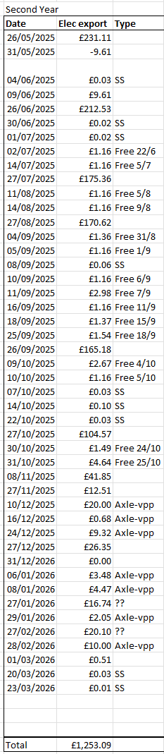11 months into my 2nd year and I’m £1,250 pounds of export, saving sessions, free electricity and Axle VPP, (my 1st year totaled
