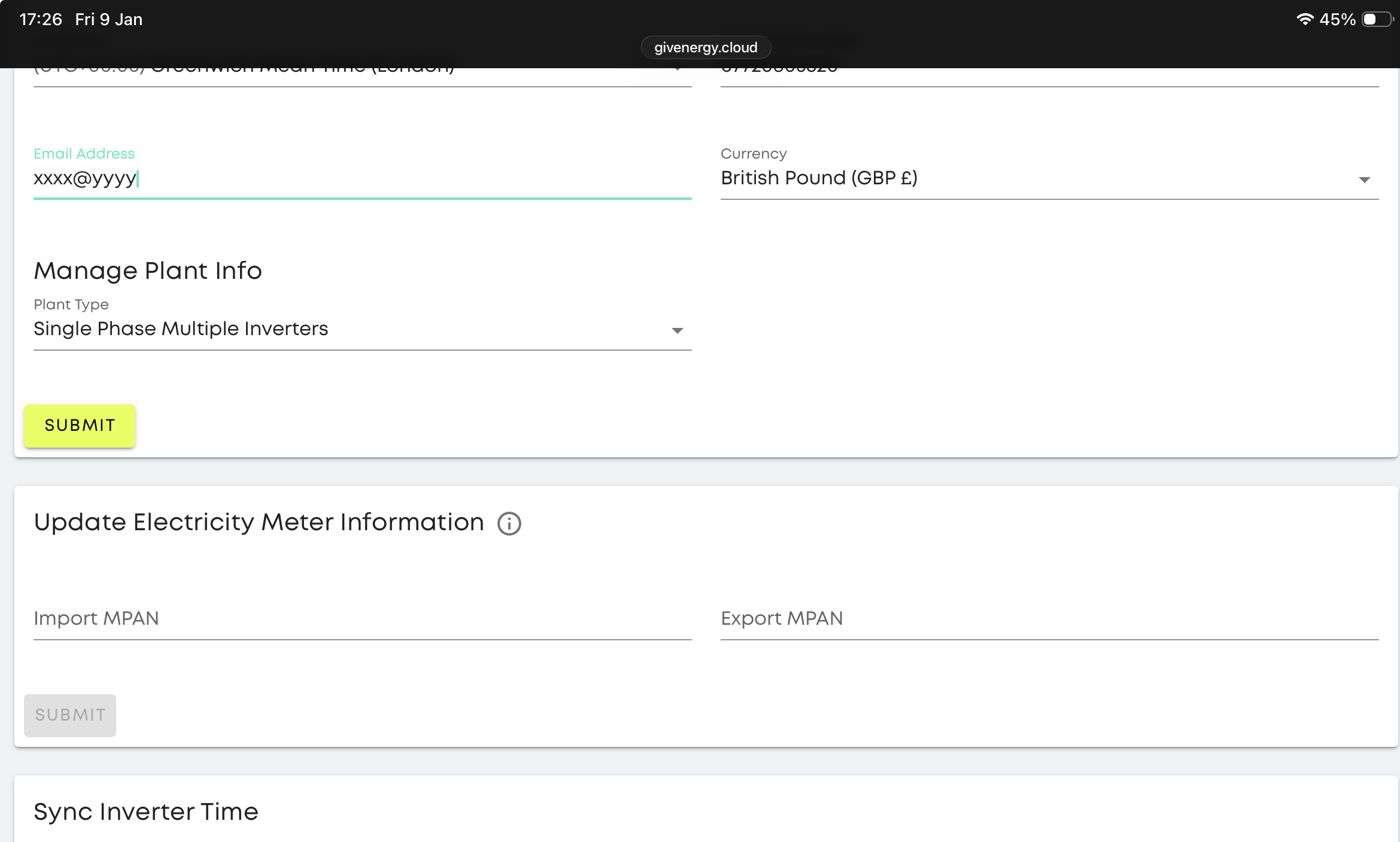 as soon as I deleted a single character from my exiting email address (i.e. changed it), the Submit button went Greeny/Yellow so I could click on it